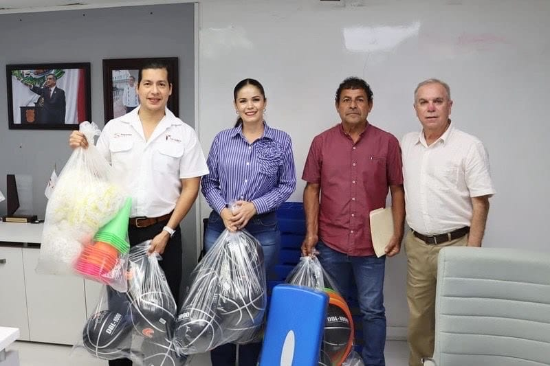 En el campo pesquero de Carbonera Norte, la alcaldesa y la titular de Bienestar estatal continuaron con la entrega de tinacos, bolsas ecológicas del programa “DIF Recicla” y equipo deportivo para dos escuelas que habían solicitado el apoyo.