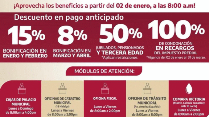 Cd. Victoria, 1 de enero de 2026.- Con el 100 por ciento de descuento en recargos, el gobierno de Victoria abrirá este viernes 2 de enero las cajas de la tesorería municipal para la atención de contribuyentes que acudan a realizar el trámite de pago del impuesto predial 2026.