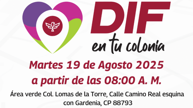 El Sistema DIF-Reynosa, que preside Carlos Luis Peña Garza, invita a las familias de la colonia Lomas de la Torre y sectores aledaños a participar en la Brigada “DIF en Tu Colonia”, que se realizará este martes 19 de agosto, a partir de las 8:00 de la mañana, en el área verde ubicada en calle Camino Real esquina con Gardenia.