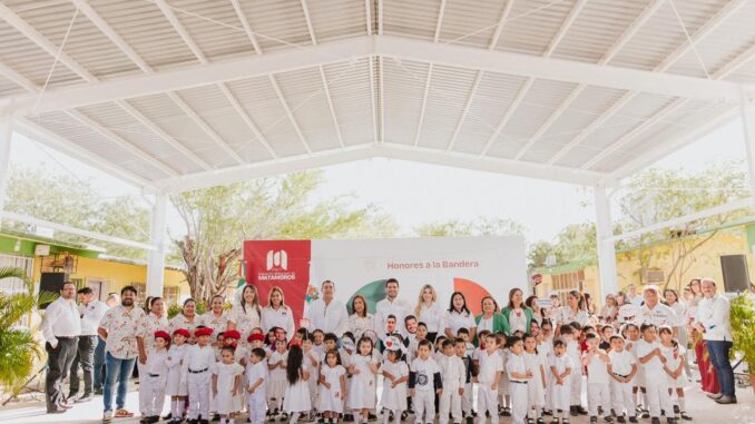 H. Matamoros, Tamaulipas.- El alcalde Beto Granados encabezó la ceremonia de Honores a la Bandera en el Jardín de Niños Estefanía Castañeda, donde además inauguró la nueva techumbre destinada a proteger a la comunidad escolar de las inclemencias del tiempo. La directora del plantel, María Teresa Ruiz, dio la bienvenida al mandatario municipal y expresó un profundo agradecimiento por la obra que, afirmó, representa una mejora significativa para las actividades pedagógicas, físicas y culturales de los alumnos.