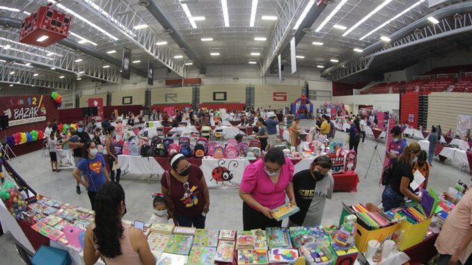 En  la Expo Regreso a Clases 2022 se podrán adquirir útiles escolares, cuadernos, plumas, lápices , colores,  calzado, entre otros artículos.Puede ser una imagen de 7 personas, personas de pie e interior