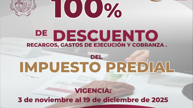 En la Vigésima Sexta Sesión Ordinaria de Cabildo, fue aprobado por unanimidad el descuento del 100% en recargos, gastos de ejecución y cobranza en el pago del impuesto predial, beneficio que estará vigente del 3 de noviembre al 19 de diciembre de este año.