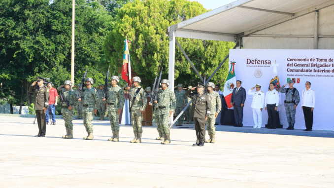 Ciudad Victoria, Tamaulipas. – El gobernador Américo Villarreal Anaya asistió como invitado de honor a la toma de posesión al cargo y protesta de bandera del general brigadier de Estado Mayor, Newton Manuel Chávez Baños, como comandante interino de la 48 Zona Militar.