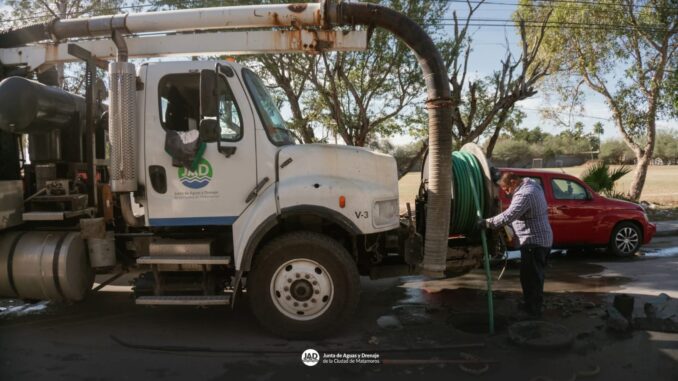 H. Matamoros, Tamaulipas.- Siguiendo las indicaciones del alcalde de Matamoros, Beto Granados, personal de la Junta de Aguas y Drenaje continúa realizando trabajos de limpieza y desazolve en diversas colonias de la ciudad, utilizando el camión vactor para garantizar el correcto funcionamiento de las líneas de drenaje sanitario.