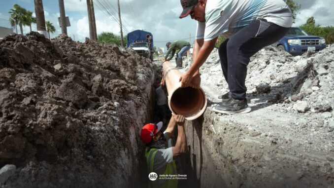 H. Matamoros, Tamaulipas.- El alcalde Beto Granados supervisó los avances de la obra de rehabilitación de la línea sanitaria en la carretera Sendero Nacional, donde se instala tubería de 12 pulgadas para mejorar el servicio y prevenir futuros colapsos.