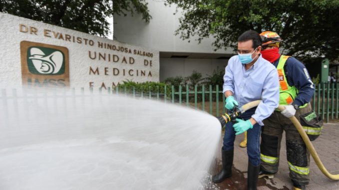 Como parte de las acciones del gobierno municipal para cuidar la salud del personal médico que labora en la Unidad de Medicina Familiar (UMF) 78 del Instituto Mexicano del Seguro Social (IMSS), el alcalde Enrique Rivas entregó insumos y encabezó la sanitización y limpieza del lugar en prevención del coronavirus.