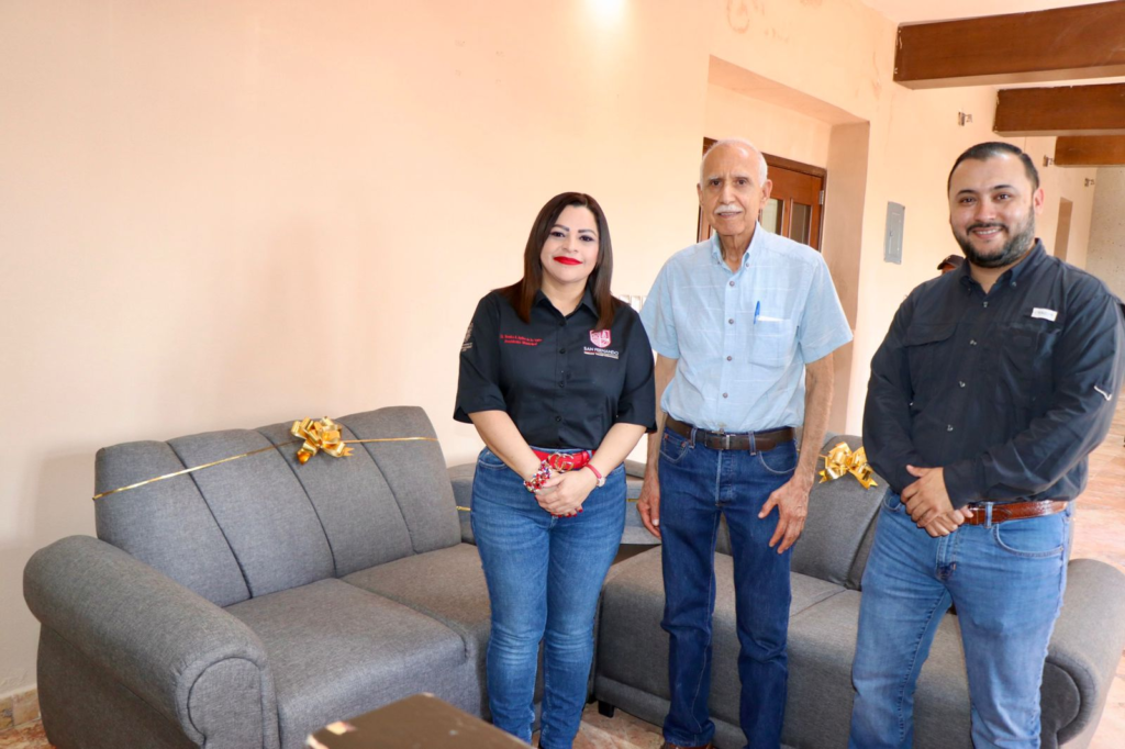 La alcaldesa Verónica Aguirre, acompañada del director municipal de Catastro, Ing. Juan Manuel Jiménez Núñez, entregó el último de los tres premios al señor José Jaime Gómez Garza, vecino de la colonia Paso Real, quien resultó ganador de una sala.