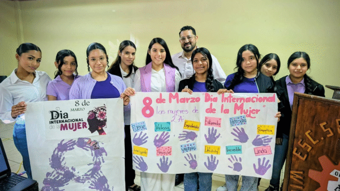 Miguel Alemán, Tam.- En un ambiente de alegría y reconocimiento a la mujer, se llevó a cabo por parte de la presidenta del Sistema DIF Miguel Alemán, la Dra. Andrea Cortez de Cavazos, esta conmemoración y dónde acudió a la Esc. Secundaria Técnica No. 49 “Wilfrido Massieu” como ponente de la conferencia “Amor propio y auto reconocimiento” acompañada por la psicóloga Jessica Guerra.