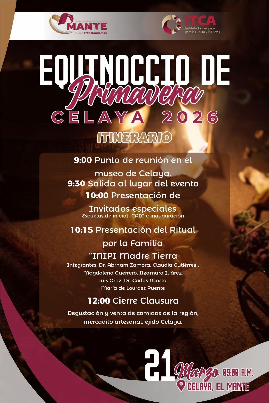 El Gobierno Municipal El Mante 2024-2027 que encabeza Patty Chio, en coordinación con el ITCA Tamaulipas y las Artes y el Comité Organizador del Ejido Celaya, te invitan a vivir una experiencia llena de tradición, energía y conexión con la naturaleza durante el Equinoccio de Primavera Celaya 2026.