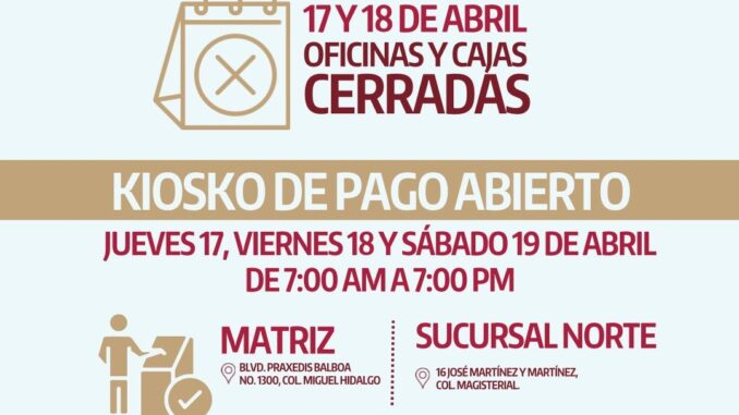 Durante este periodo, los usuarios podrán realizar sus pagos a través de los kioscos de autopago, los cuales operarán en horario de 7:00 a.m. a 7:00 p.m., del jueves 17 al sábado 19 de abril, ubicados en la oficina matriz y en la sucursal norte.