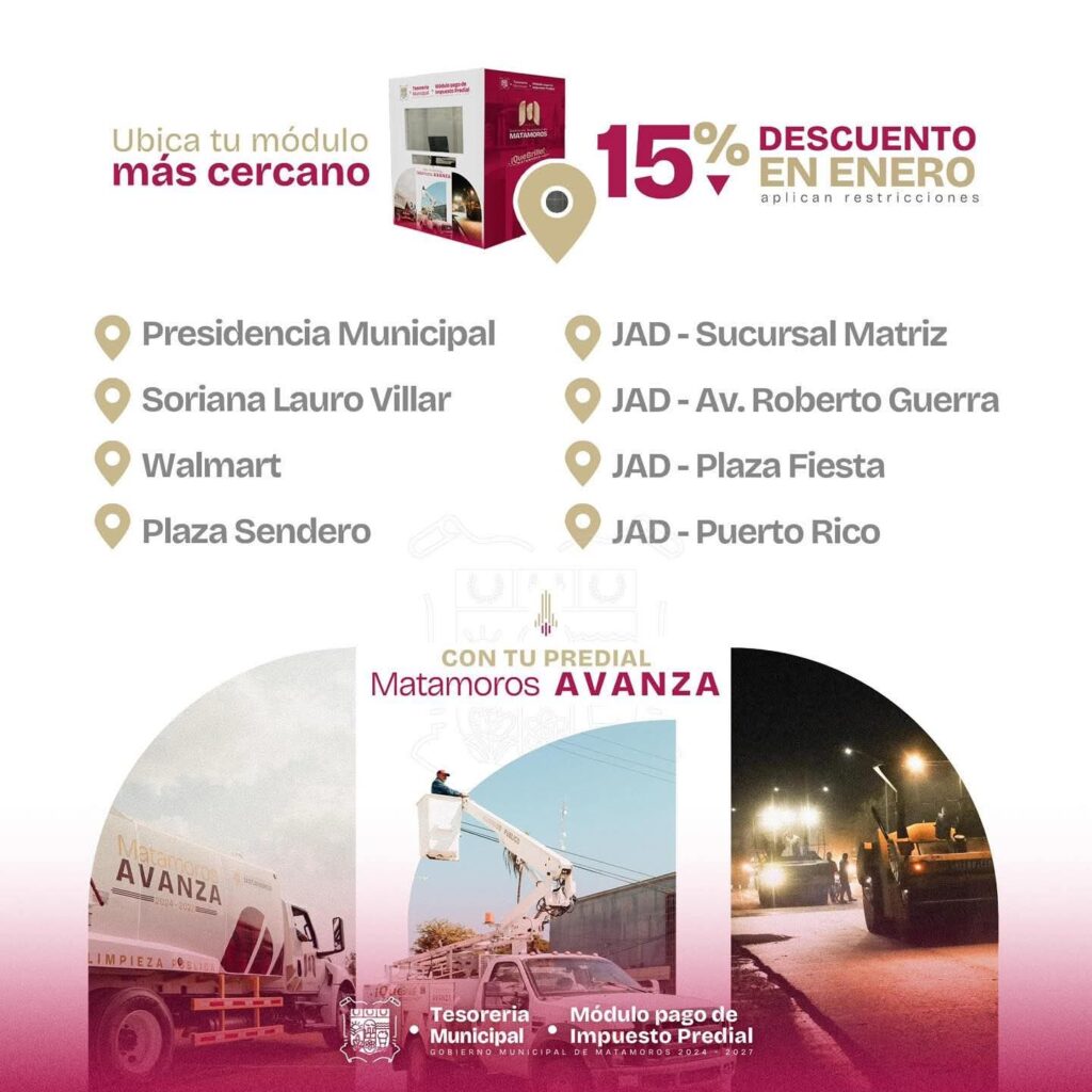 Durante el mes de enero, los contribuyentes pueden aprovechar un 15 por ciento de descuento en el pago del impuesto predial, apoyando directamente a que Matamoros continúe avanzando como un territorio en transformación.