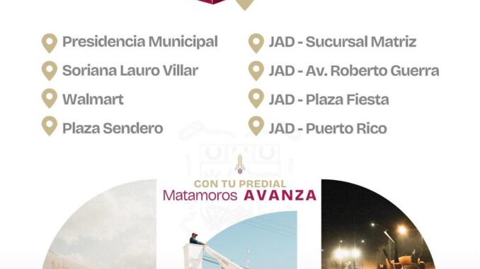 H. Matamoros, Tamaulipas.- Por instrucción del alcalde de Matamoros, Beto Granados, el Gobierno Municipal activó módulos de pago del Impuesto Predial en distintos puntos de la ciudad, con el objetivo de acercar este servicio a la ciudadanía y facilitar el cumplimiento de esta contribución.