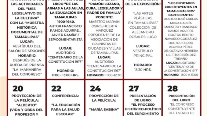 La programación, que dio inicio desde los primeros días de octubre, es impulsada por la Diputada Blanca Aurelio Anzaldúa Nájera, Presidenta de la Comisión de Cultura, y ha incluido conferencias, presentaciones editoriales, eventos conmemorativos y actividades dirigidas a diversos sectores de la sociedad.