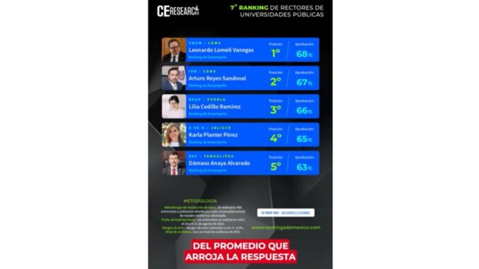Ciudad Victoria, Tam.- Por segunda ocasión, Dámaso Anaya Alvarado, resultó entre los rectores de las universidades públicas mejor calificados del país, reveló la reciente encuesta realizada por CE RESEARCH.