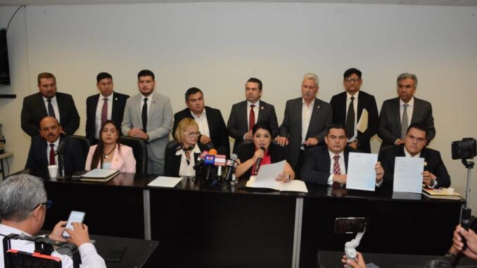 La diputada Úrsula Salazar Mojica, acompañada por los legisladores morenistas, informó en conferencia de prensa, que las denuncias han sido ingresadas y llevadas al ámbito federal por Morena a fin de que las acusaciones no sean encarpetadas como hubiera sucedido en la Fiscalía del Estado y confió en que las instancias les den la razón y se haga valer la justicia en contra de quienes han causado daño al erario del pueblo tamaulipeco.