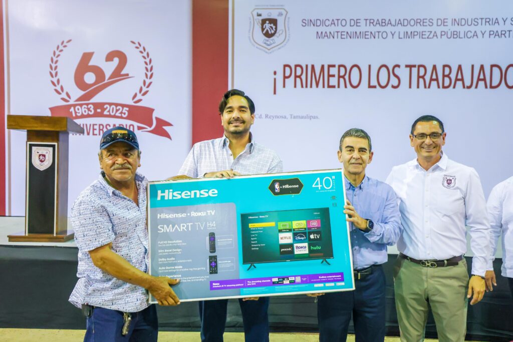 El Presidente Municipal Carlos Peña Ortiz celebró con los integrantes del Sindicato de Trabajadores de Industria y Servicios, Mantenimiento y Limpieza Pública y Particular, el 62 Aniversario de su fundación, junto con el Secretario General del gremio, Jorge Barajas Yebra, y con el Secretario General de la Federación de Trabajadores de Reynosa, Reynaldo Garza Elizondo.