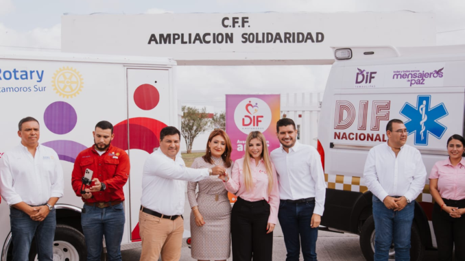 Matamoros, Tamaulipas.– Con el objetivo de mejorar la atención médica y los servicios de emergencia en la ciudad, el Club Rotario Matamoros Sur donó una ambulancia al Sistema DIF Matamoros. La entrega se llevó a cabo en las instalaciones del CEDIF de la colonia Ampliación Solidaridad, con la presencia del alcalde Alberto Granados Fávila y la presidenta del DIF Matamoros, Ana Ariceaga de Granados.