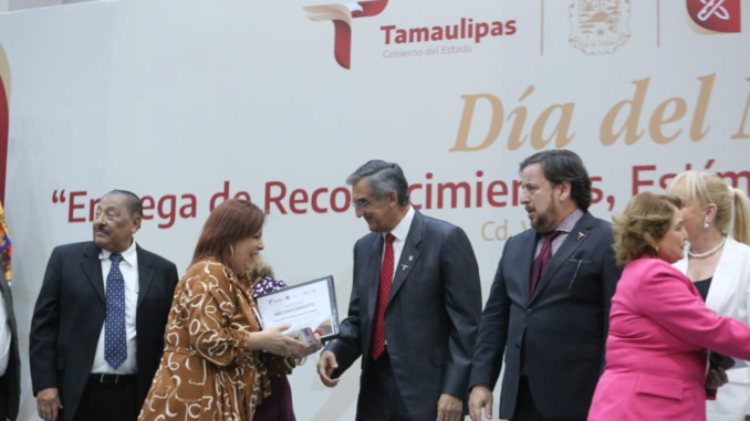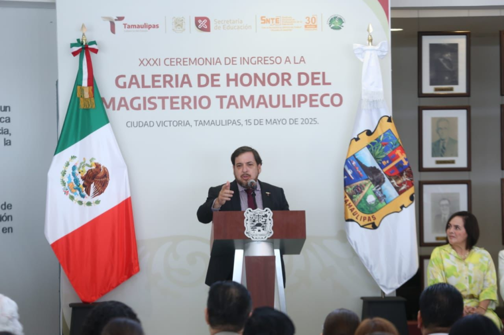 Por la mañana, en el Centro Regional de Formación Docente e Investigación Educativa (CRETAM), Villarreal Anaya presidió la ceremonia de ingreso a la Galería de Honor del Magisterio Tamaulipeco, y entregó reconocimiento y la medalla Lauro Aguirre a la galardonada de Educación Básica, doctora María de Jesús Lara Tijerina, y a la doctora Lucila Olvera Flores, galardonada de Educación Media Superior y Superior.
