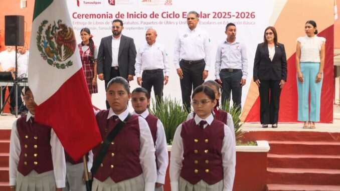 El Presidente Municipal Biol. Ramiro Cortez Barrera, acompañado del secretario de Seguridad Pública en Tamaulipas, Gral. Carlos Pancardo Escudero, encabeza la ceremonia de Inicio del Ciclo Escolar 2025-2026 en la Escuela Secundaria Técnica No 49 «Wilfrido Massieu».