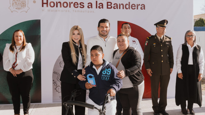 H. Matamoros, Tamaulipas.- La mañana de este lunes 10 de marzo, el alcalde de Matamoros, Beto Granados, encabezó la ceremonia de honores en el Centro de Atención Múltiple (CAM) Tzehuali 1 de Educación Especial, donde dio inicio a la campaña «Mi lugar, mi derecho». Durante el evento, entregó los primeros tarjetones de discapacidad universal, temporal y materno a ciudadanos beneficiados.