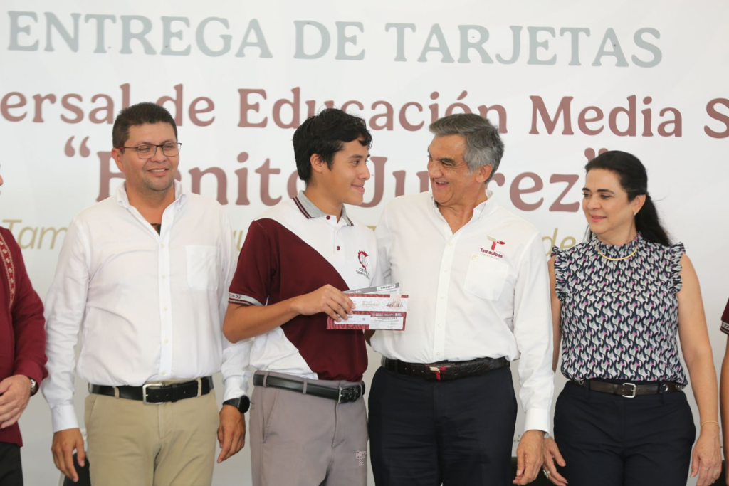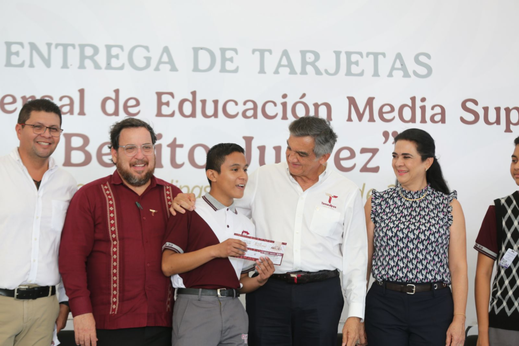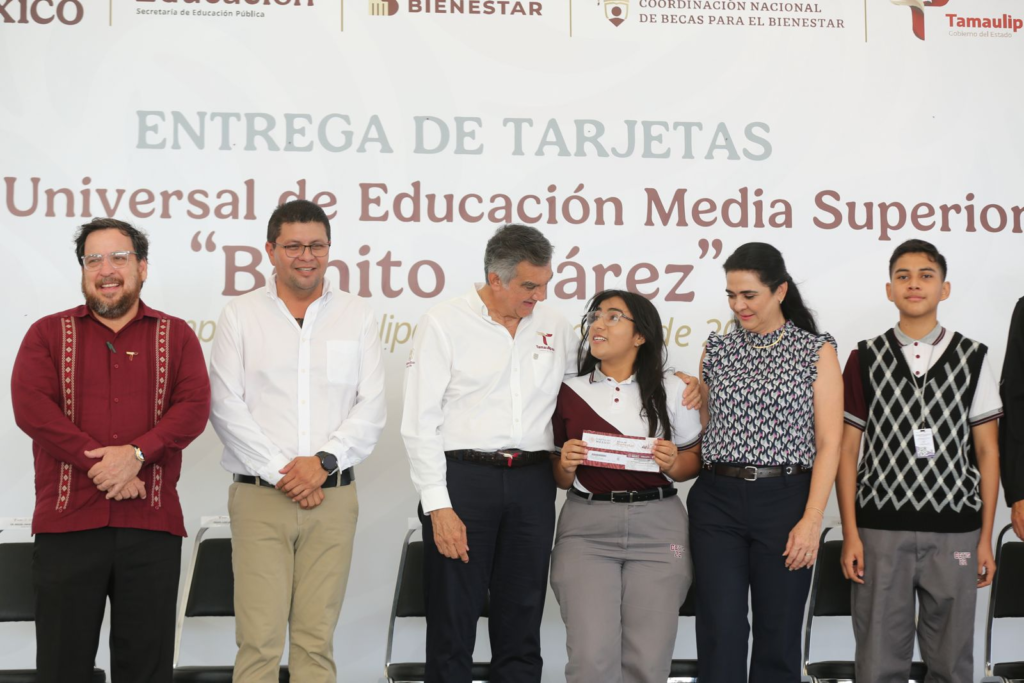 Tampico, Tamaulipas.- Un total de 450 alumnos del CETIS número 22, turno matutino, de esta ciudad, recibieron de manos del gobernador Américo Villarreal Anaya y del delegado de Bienestar Federal, Luis Lauro Reyes Rodríguez, las tarjetas de la Beca Universal de Educación Media Superior «Benito Juárez», lo que representa la dispersión de un millón 710 mil pesos.