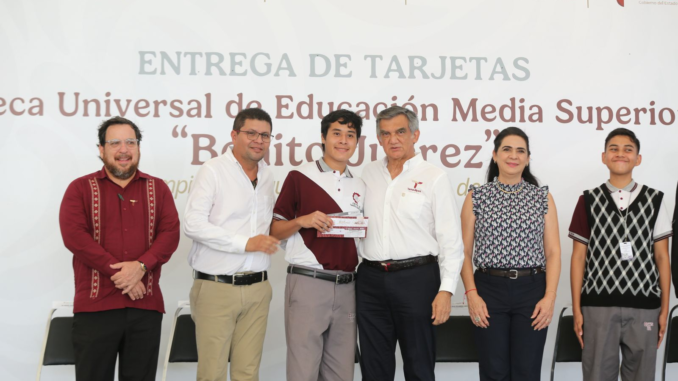 Tampico, Tamaulipas.- Un total de 450 alumnos del CETIS número 22, turno matutino, de esta ciudad, recibieron de manos del gobernador Américo Villarreal Anaya y del delegado de Bienestar Federal, Luis Lauro Reyes Rodríguez, las tarjetas de la Beca Universal de Educación Media Superior «Benito Juárez», lo que representa la dispersión de un millón 710 mil pesos.