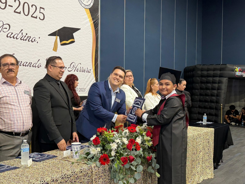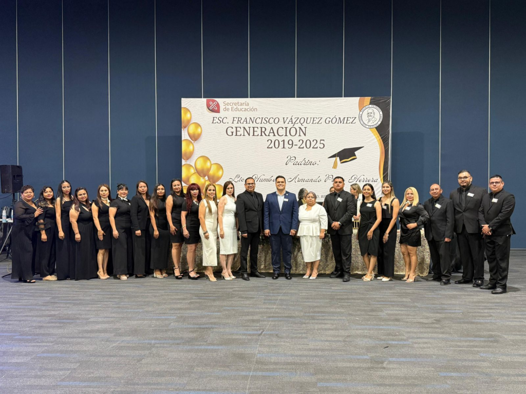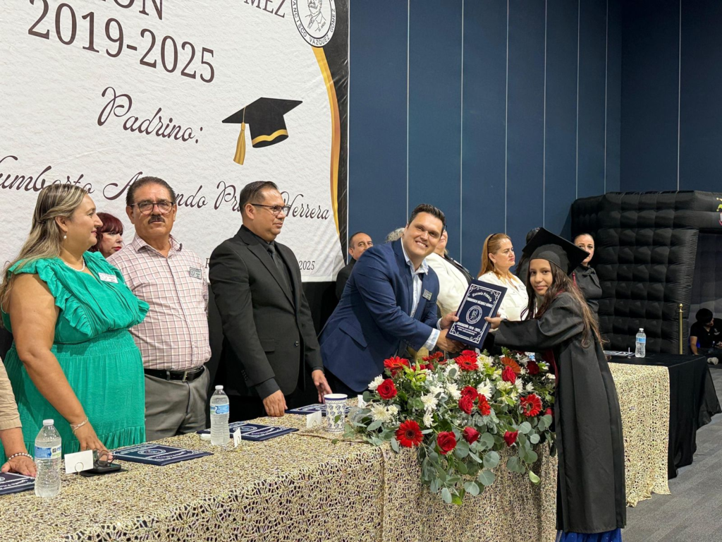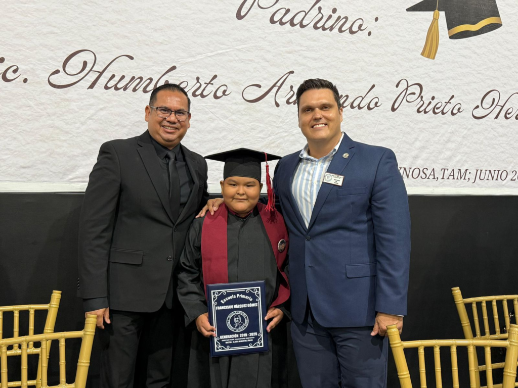 Junto al director del plantel educativo, Juan Antonio Ruiz Rocha, personal docente, autoridades escolares y las familias de los graduados, Humberto Prieto Herrera agradeció la invitación para apadrinar a los alumnos de los tres grupos que concluyeron con estudios de primaria, en el periodo 2019-2025 de la escuela Francisco Vázquez Gómez, reafirmando su compromiso con la niñez de Reynosa y Tamaulipas.