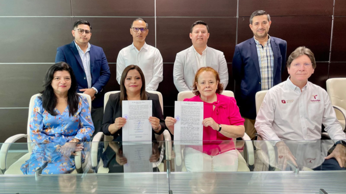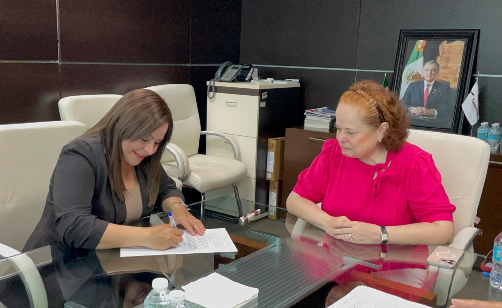 Reuniendose la primera autoridad del municipio Vero Aguirre con la Secretaria de Administración, C.P. Luisa Eugenia Manautou Galván, en representación del Gobernador de Tamaulipas, Dr. Américo Villarreal Anaya y llevar a cabo la firma de la escritura del terreno que da certeza jurídica.