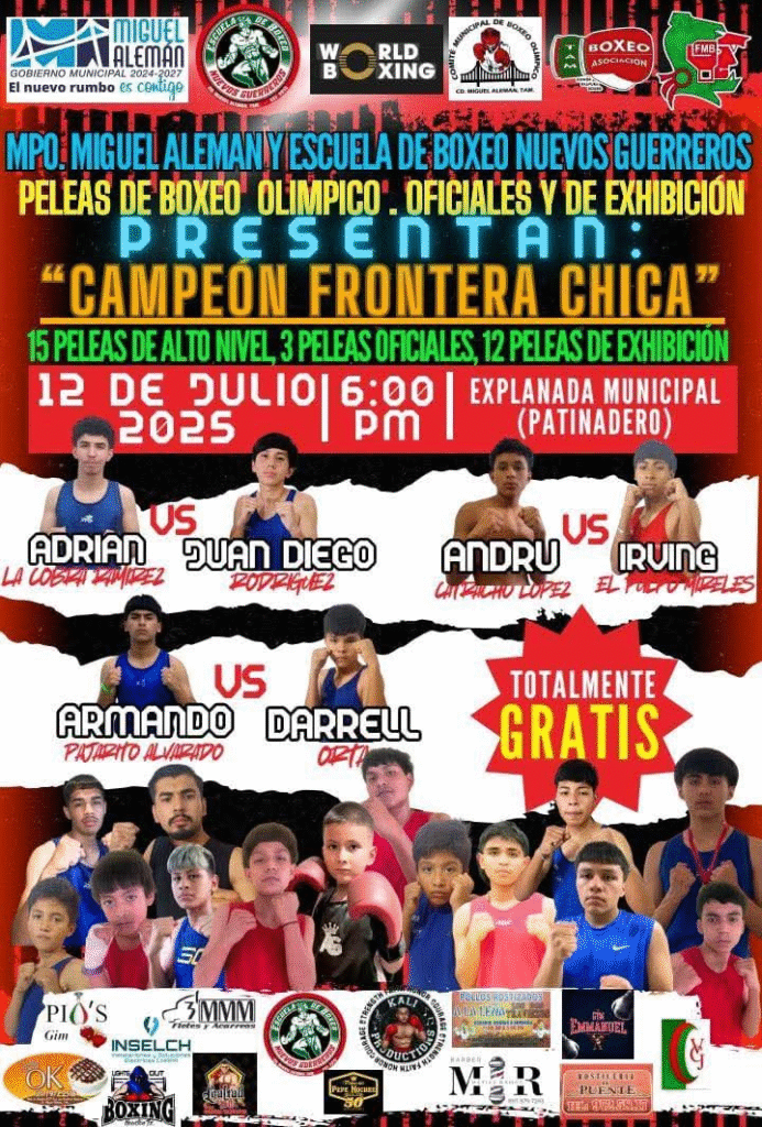 El Gobierno del Biol. Ramiro Cortez Barrera y la Escuela de Boxeo “Nuevos Guerreros” del entrenador Nelson Chapa, ofrecerán a todas las familias el esperado evento “Campeón Frontera Chica” con 15 peleas de alto nivel, 12 peleas de exhibición y 3 peleas oficiales.