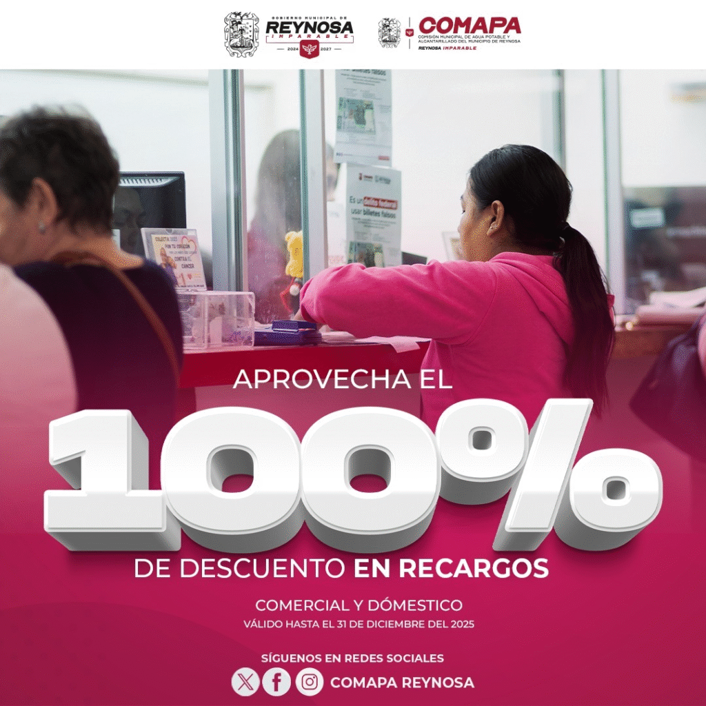 Por instrucciones del Presidente Municipal, Carlos Peña Ortiz, la Comisión Municipal de Agua Potable y Alcantarillado de Reynosa informa a la ciudadanía que se amplió hasta el 31 de diciembre del 2025 el plazo del programa de apoyo que otorga el 100% de descuento en recargos por adeudo a los usuarios de los servicios doméstico y comercial.