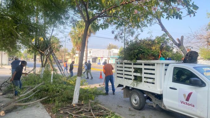 El Gobierno de Victoria mantiene los trabajos de limpieza y mantenimiento de vialidades y áreas verdes de la ciudad con intensa jornada trabajos de chapoleo, poda y recolección de maleza en el primer cuadro de la capital.