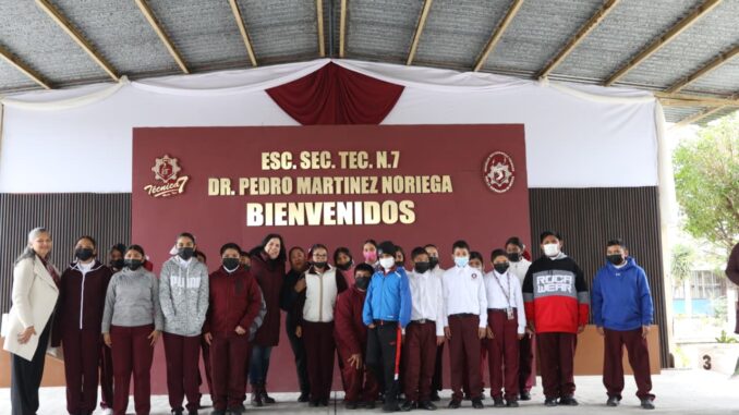 Acompañada por la Directora del Sistema DIF El Mante, Erika Torres Velázquez, miembros del Honorable Cabildo, el Jefe del CREDE, Israel Regalado Pérez, y la directora de la secundaria Dimary Borjas, la Alcaldesa informó que este año se ha logrado un incremento del 30% en el padrón de escuelas beneficiadas por el Sistema DIF Tamaulipas que Preside la Dra. María de Villarreal, aunado a la inversión municipal directa aprobada para este ejercicio.