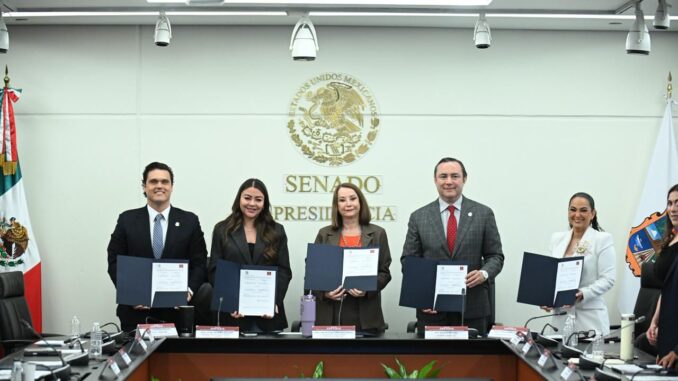 La y el Presidente de las mesas directivas del Senado y el Congreso local, Laura Itzel Castillo Juárez y Sergio Ojeda Castillo, signaron el convenio, al igual que el diputado presidente de la Junta de Gobierno, Humberto Prieto Herrera y la senadora tamaulipeca Olga Sosa Ruiz, en calidad de testigos de honor.