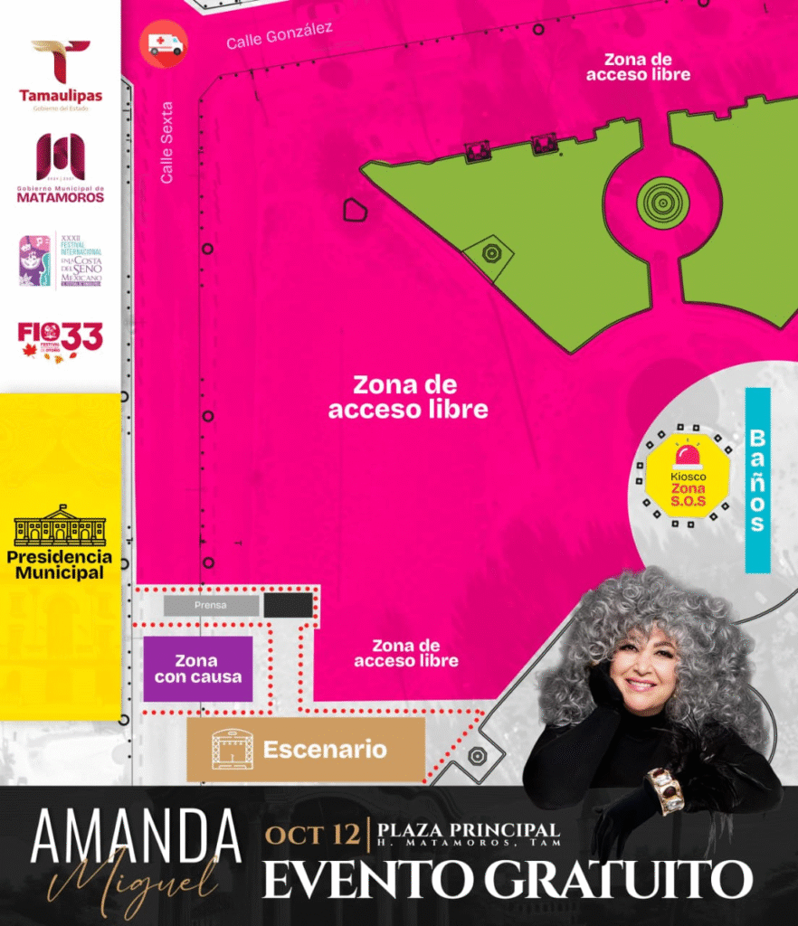 H. Matamoros, Tamaulipas.– El Gobierno de Beto Granados dio a conocer el croquis oficial del concierto gratuito de Amanda Miguel, que se llevará a cabo este domingo 12 de octubre en la Plaza Principal.