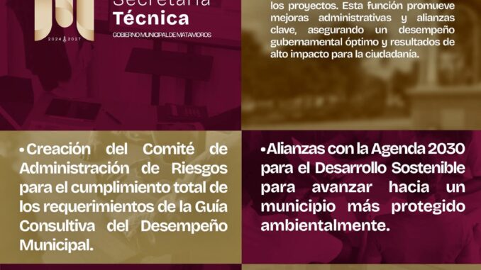 H. Matamoros, Tamaulipas.– El gobierno de Beto Granados informó que, durante los meses de octubre y noviembre, la Secretaría Técnica reforzó la dirección estratégica del Gobierno Municipal mediante diversas acciones enfocadas en la mejora administrativa, la coordinación interinstitucional y el seguimiento integral de proyectos considerados prioritarios para la ciudad.