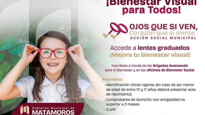 Matamoros, Tam.- El Gobierno de Beto Granados, a través de la Acción Social Municipal, invita a la ciudadanía a participar en el programa de lentes graduados, una iniciativa que busca mejorar la calidad de vida de niñas, niños, jóvenes, adultos y personas mayores que requieren apoyo para su bienestar visual.