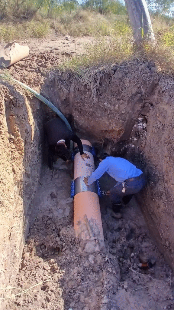 Matamoros, Tam.- El Gobierno de Matamoros, encabezado por el alcalde Beto Granados, a través de la Junta de Aguas y Drenaje de Matamoros, realizó trabajos de reparación en una línea de presión de 16 pulgadas ubicada en la calle Rincón de las Brisas y Brecha 30 del Fraccionamiento Rinconada de las Brisas. Estas labores se efectuaron con el objetivo de garantizar un servicio eficiente y continuo a las familias del sector.