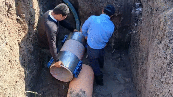 Matamoros, Tam.- El Gobierno de Matamoros, encabezado por el alcalde Beto Granados, a través de la Junta de Aguas y Drenaje de Matamoros, realizó trabajos de reparación en una línea de presión de 16 pulgadas ubicada en la calle Rincón de las Brisas y Brecha 30 del Fraccionamiento Rinconada de las Brisas. Estas labores se efectuaron con el objetivo de garantizar un servicio eficiente y continuo a las familias del sector.