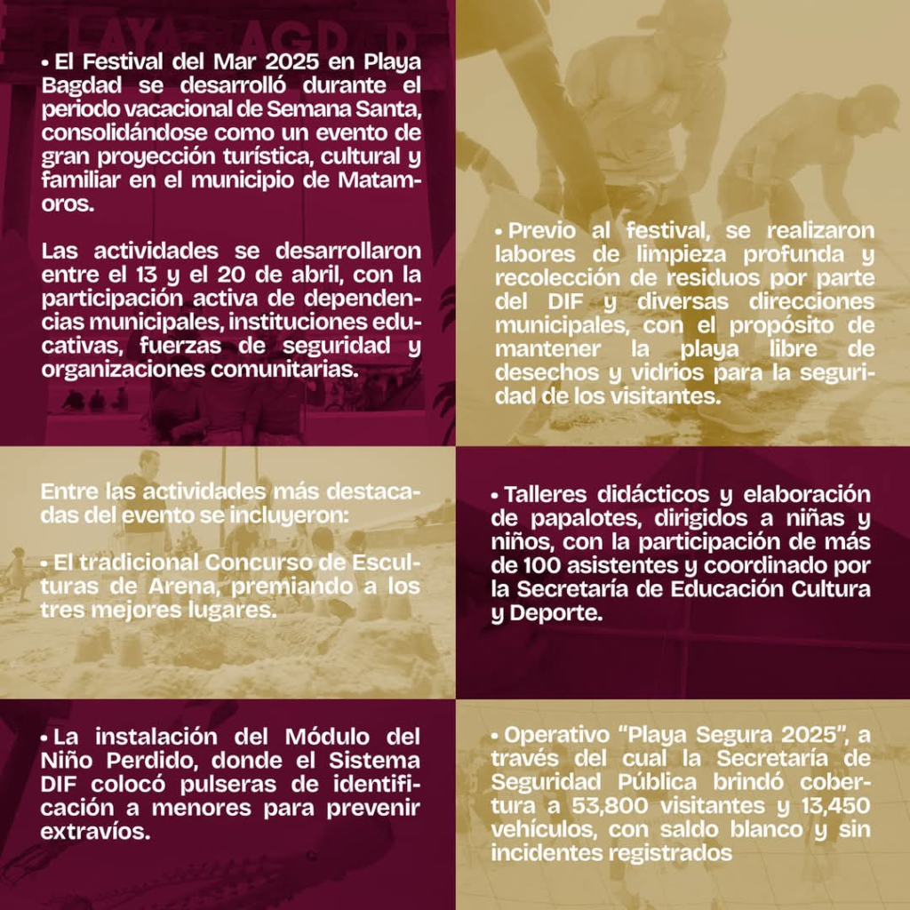 La participación en programas comunitarios y la organización de eventos emblemáticos como el Festival del Mar 2025, permitieron impulsar la economía local y promover la identidad cultural de la ciudad. Estos eventos atraen a visitantes y fomentan la interacción entre la comunidad y los turistas, lo que beneficia a los negocios locales y promueve el desarrollo económico.
