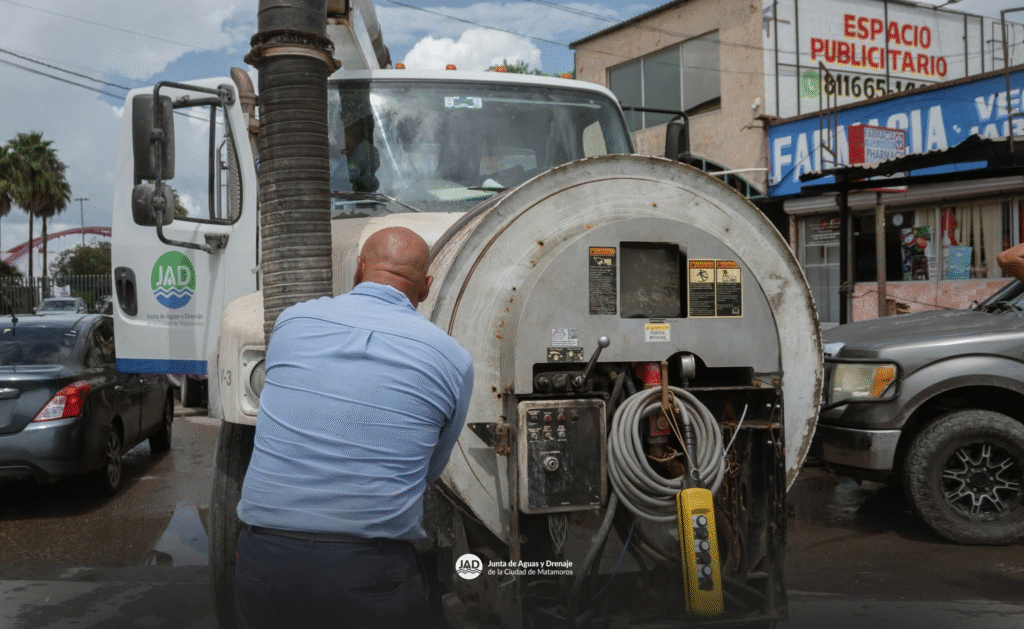 H. Matamoros, Tamaulipas.- El Gobierno Municipal de Matamoros, presidido por el alcalde, Beto Granados, a través de las cuadrillas de la Junta de Aguas y Drenajes, continúa realizando labores de limpieza y desazolve en distintos puntos de la ciudad, con el apoyo del camión vactor.