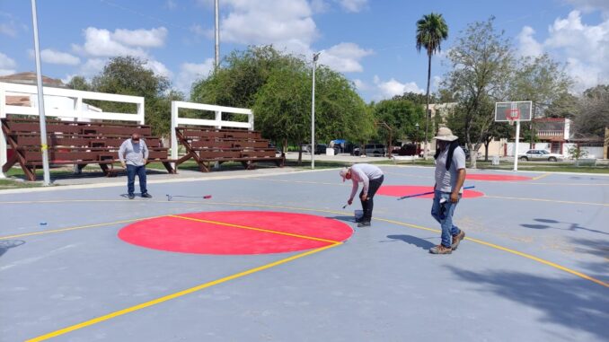 RIO BRAVO.-Debido a que este fin de semana se realizan trabajos de pintura en las canchas de baloncesto de Plaza Ignacio Zaragoza, mejor conocida como la de Los Enamorados, el Gobierno de Río Bravo exhorta a usuarios y visitantes a respetar el área acordonada.