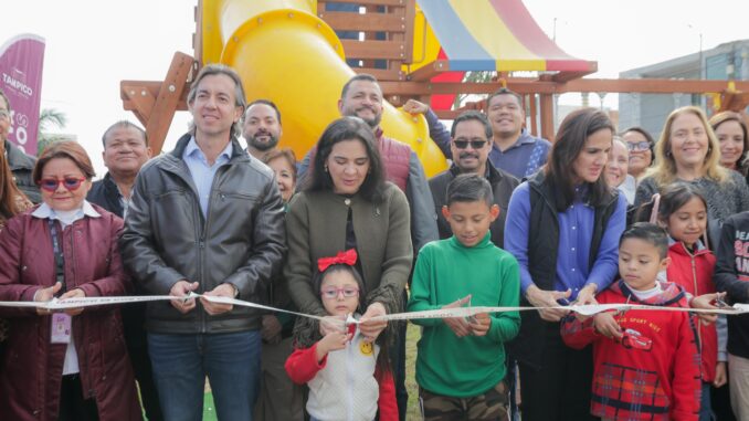 La primera autoridad, acompañada de la Presidenta del Sistema DIF Tampico, Dra. Luz Adriana Villarreal Anaya, y del empresario Jorge Eduardo Eichelmann Muela, destacó que este nuevo espacio fue posible gracias a la donación de juegos y mobiliario por parte de la iniciativa privada, reflejo -dijo- del trabajo coordinado entre el gobierno municipal y el sector empresarial.