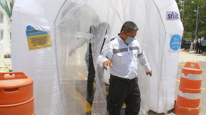 túnel, el usuario es rociado con la solución en su cuerpo para ser sanitizado y protegido;