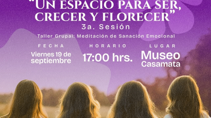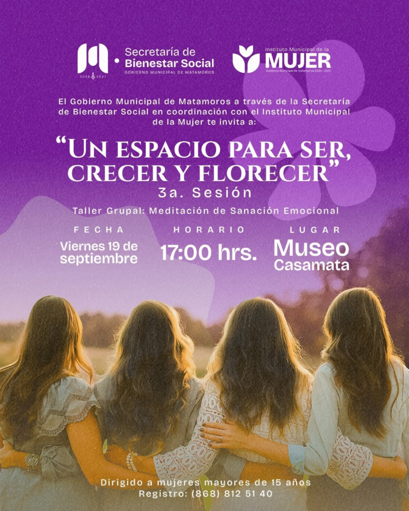Matamoros, Tam.- Gobierno de Beto Granados informó que este viernes 19 de septiembre se llevará a cabo la tercera sesión del taller grupal “Un espacio para ser, crecer y florecer”, dirigido a mujeres mayores de 15 años, en el Museo Casamata a las 17:00 horas.