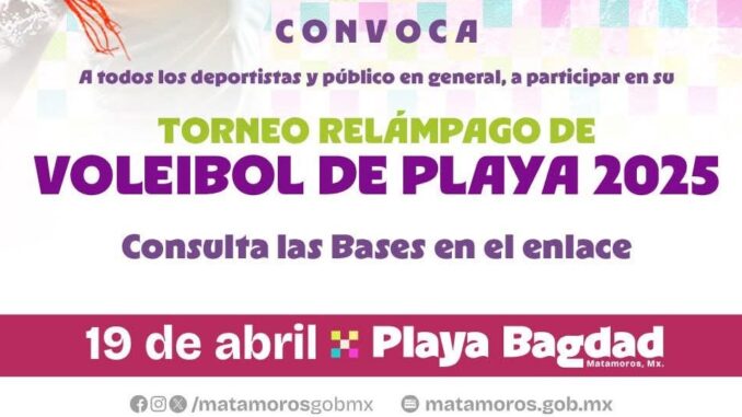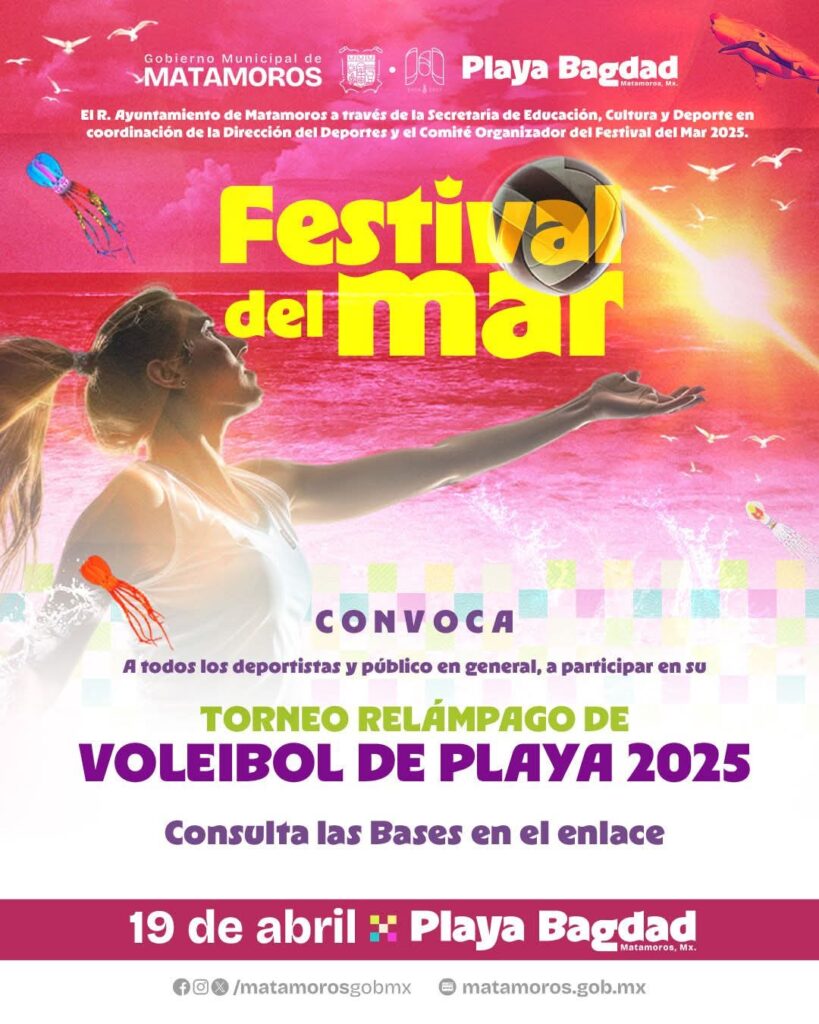 H. Matamoros, Tamaulipas.— En el marco del Festival del Mar 2025, se llevará a cabo un emocionante Torneo Relámpago de Voleibol de Playa, el próximo sábado 19 de abril a partir de las 10:00 de la mañana en el Parque Costero de la Playa Bagdad, donde se espera una jornada llena de deporte, energía y diversión para toda la familia.