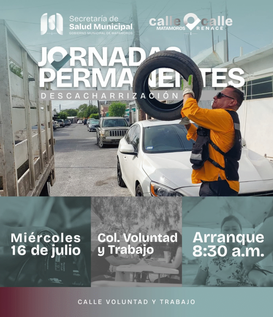 H. Matamoros, Tamaulipas.- En el marco de las Jornadas permanentes de descacharrización, se informa a la comunidad que este miércoles, las brigadas municipales estarán llevando a cabo labores de limpieza y recolección de objetos inservibles en la colonia Voluntad y Trabajo, a partir de las 8:30 de la mañana.