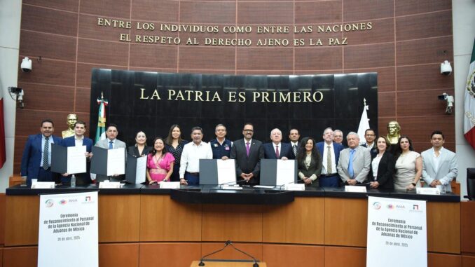CDMX.-La comisión de Asuntos de la Frontera Norte del Senado de la República, realizó entrega de reconocimiento a Rafael Marín Mollinedo titular de la ANAM y a 24 titulares de las Aduanas de México por su trabajo para fortalecer el comercio, la seguridad fronteriza y el desarrollo económico.