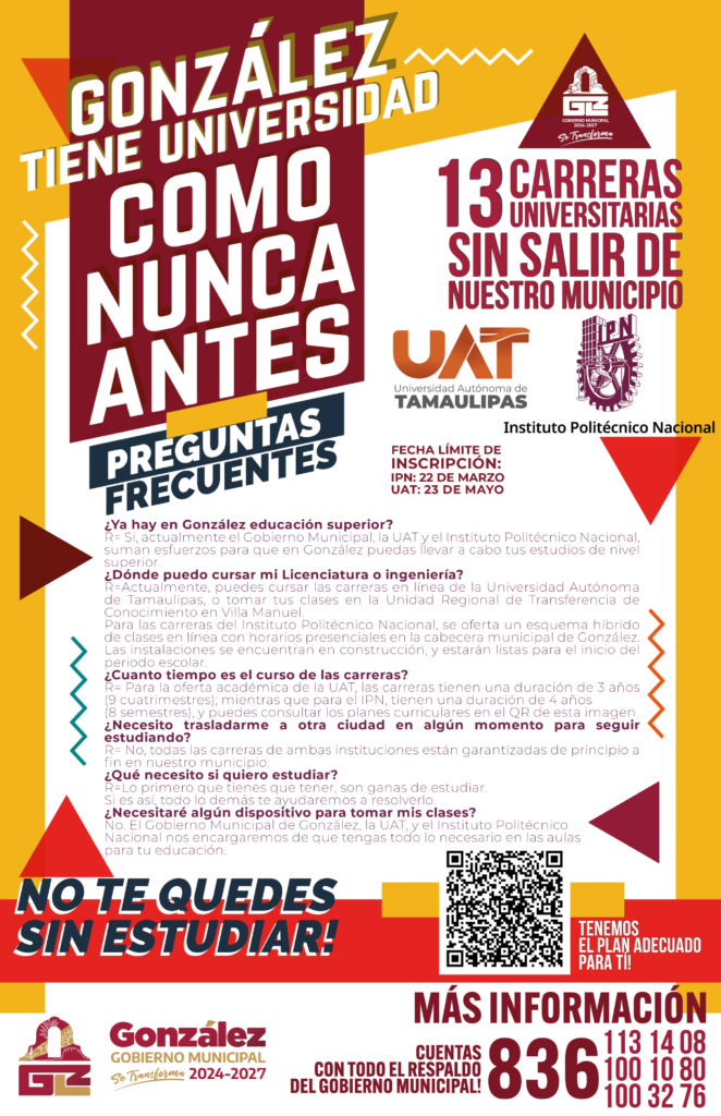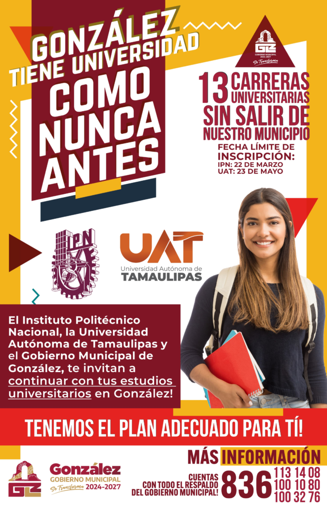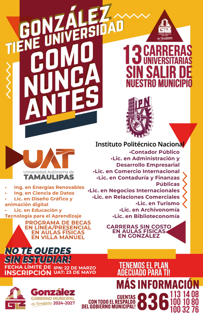 A través de convenios con la Universidad Autónoma de Tamaulipas (UAT) y el Instituto Politécnico Nacional (IPN), se ofertarán 13 carreras profesionales, brindando una oportunidad única para el desarrollo personal y profesional de los jóvenes de González.