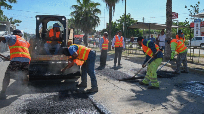 Los trabajos de restauración de pavimento dañado se realizaron del boulevard Práxedis Balboa a calle 16 de septiembre, donde las recientes lluvias y constante tráfico vehicular ocasionaron grave daño en la superficie de rodamiento en ambos sentidos de la avenida.