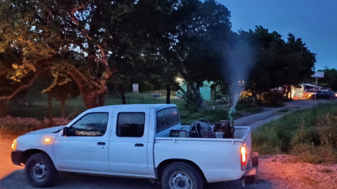 Esta noche se llevaron a cabo acciones de nebulización nocturna en los ejidos Alfredo V. Bonfil, La Lomita y Ampliación Vergeles, ubicados en la zona norte del municipio, con el propósito de combatir al mosquito Aedes aegypti, transmisor de enfermedades como dengue, zika y chikungunya.
